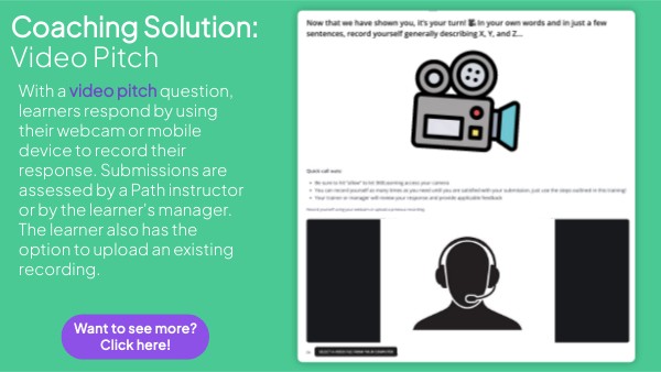 With a video pitch question, learners respond by using their webcam or mobile device to record their response. Submissions are assessed by a Path instructor or by the learner's manager. The learner also has the option to upload an existing recording.