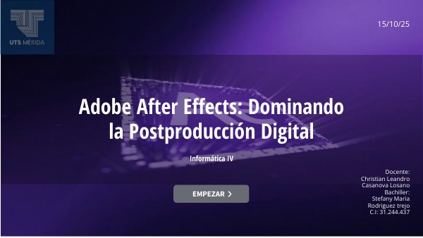 Adobe After Effects es una herramienta profesional de composición y animación utilizada en la industria audiovisual para crear efectos visuales (VFX), motion graphics y títulos animados. Su integración con otros programas de Adobe, como Premiere Pro, lo convierte en el estándar de la postproducción moderna. Dominar After Effects permite desarrollar proyectos creativos de alta calidad, desde publicidad hasta cine y redes sociales.