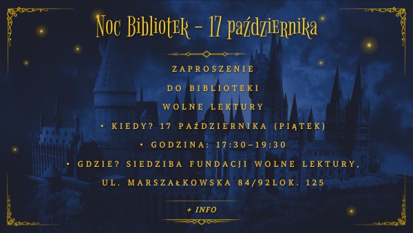 Zaproszenie do biblioteki Wolne Lektury • Kiedy? 17 października (piątek) • Godzina: 17:30–19:30 • Gdzie? Siedziba Fundacji Wolne Lektury, ul. Marszałkowska 84/92lok. 125