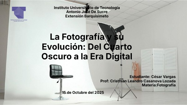 Reflexión personal: cuál ha sido tu aprendizaje sobre la fotografía y su evolución. Impacto actual: cómo la fotografía influye en nuestra cultura visual, comunicación, conocimiento científico, memoria colectiva. Futuro: cómo ves la fotografía en los próximos años (más interconectada, más automatizada, con nuevas tecnologías). Mensaje final: la fotografía sigue siendo una forma poderosa de conectar con el mundo, contar historias y ver la realidad con ojos nuevos.