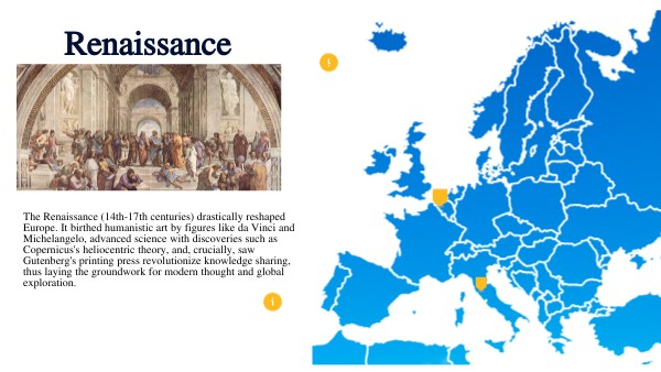 The Renaissance (14th-17th centuries) drastically reshaped Europe. It birthed humanistic art by figures like da Vinci and Michelangelo, advanced science with discoveries such as Copernicus's heliocentric theory, and, crucially, saw Gutenberg's printing press revolutionize knowledge sharing, thus laying the groundwork for modern thought and global exploration.