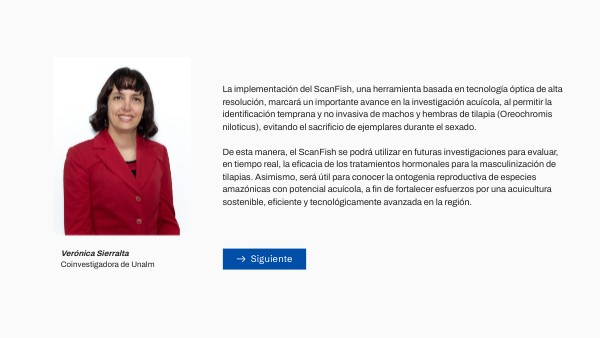 La implementación del ScanFish, una herramienta basada en tecnología óptica de alta resolución, marcará un importante avance en la investigación acuícola, al permitir la identificación temprana y no invasiva de machos y hembras de tilapia (Oreochromis niloticus), evitando el sacrificio de ejemplares durante el sexado. De esta manera, el ScanFish se podrá utilizar en futuras investigaciones para evaluar, en tiempo real, la eficacia de los tratamientos hormonales para la masculinización de tilapias. Asimismo, será útil para conocer la ontogenia reproductiva de especies amazónicas con potencial acuícola, a fin de fortalecer esfuerzos por una acuicultura sostenible, eficiente y tecnológicamente avanzada en la región.