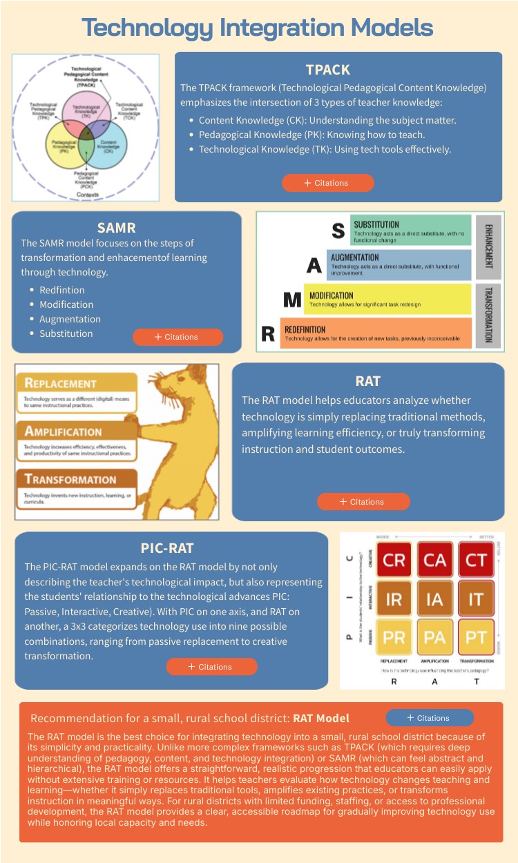 The RAT model is the best choice for integrating technology into a small, rural school district because of its simplicity and practicality. Unlike more complex frameworks such as TPACK (which requires deep understanding of pedagogy, content, and technology integration) or SAMR (which can feel abstract and hierarchical), the RAT model offers a straightforward, realistic progression that educators can easily apply without extensive training or resources. It helps teachers evaluate how technology changes teaching and learning—whether it simply replaces traditional tools, amplifies existing practices, or transforms instruction in meaningful ways. For rural districts with limited funding, staffing, or access to professional development, the RAT model provides a clear, accessible roadmap for gradually improving technology use while honoring local capacity and needs.