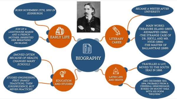 Main works: -Treasure Island (1883) -Kidnapped (1886) -The Strange Case of Dr. Jekyll and Mr. Hyde (1886) -The Master of Ballantrae (1889)