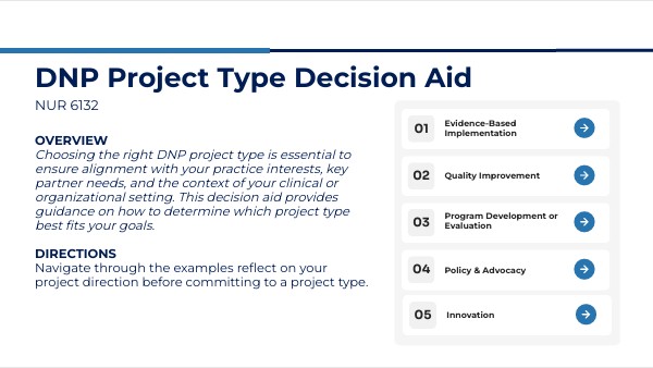 OVERVIEWChoosing the right DNP project type is essential to ensure alignment with your practice interests, key partner needs, and the context of your clinical or organizational setting. This decision aid provides guidance on how to determine which project type best fits your goals.
