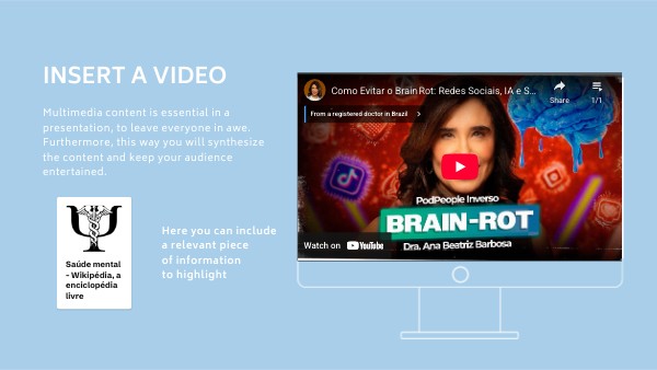 Multimedia content is essential in a presentation, to leave everyone in awe. Furthermore, this way you will synthesize the content and keep your audience entertained.