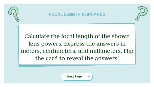 Calculate the lens power of the shown focal lengths. Round each power to the nearest quarter diopter. Flip the card to reveal the answers!