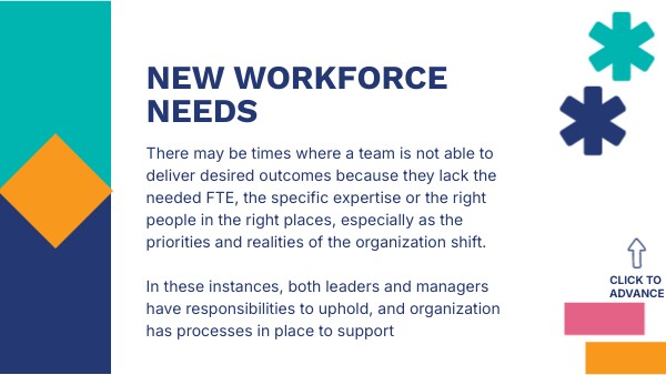 There may be times where a team is not able to deliver desired outcomes because they lack the needed FTE, the specific expertise or the right people in the right places, especially as the priorities and realities of the organization shift. In these instances, both leaders and managers have responsibilities to uphold, and organization has processes in place to support