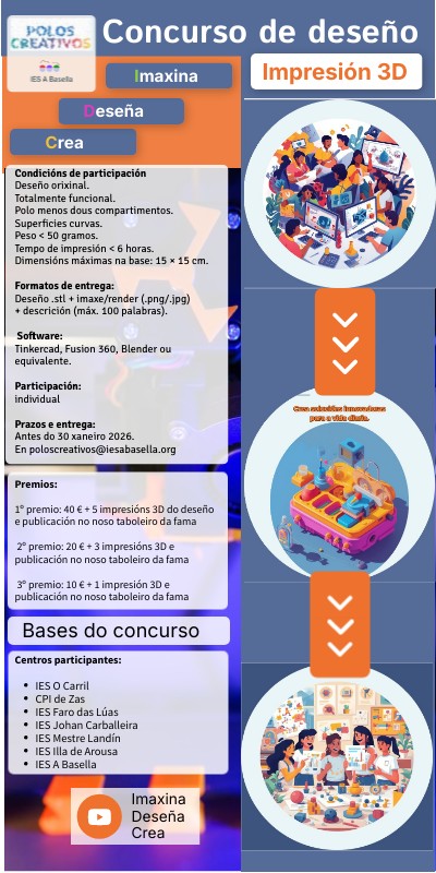Condicións de participación Deseño orixinal. Totalmente funcional. Polo menos dous compartimentos. Superficies curvas. Peso < 50 gramos. Tempo de impresión < 6 horas. Dimensións máximas na base: 15 × 15 cm. Formatos de entrega: Deseño .stl + imaxe/render (.png/.jpg) + descrición (máx. 100 palabras). Software: Tinkercad, Fusion 360, Blender ou equivalente. Participación: individual Prazos e entrega: Antes do 30 xaneiro 2026. En poloscreativos@iesabasella.org