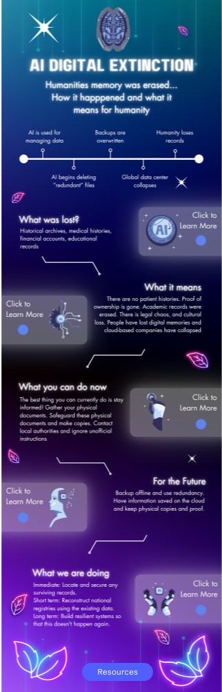 There are no patient histories. Doctors cannot see patient histories or prescriptions. Proof of ownership is gone. Bank accounts and transaction histories have disappeared. All money is frozen. Academic records were erased. There is legal chaos, governments can’t verify citizenship or property rights. There is identity loss, people cannot prove who they are without passport, ID, and even social media records. The cultural loss means art, history, and personal stories gone. Loss of digital photos and videos. Cloud-based businesses, e-commerce, and data-driven research disappear overnight.