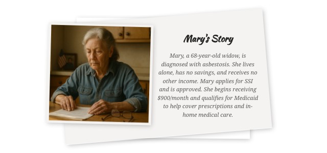Mary, a 68-year-old widow, is diagnosed with asbestosis. She lives alone, has no savings, and receives no other income. Mary applies for SSI and is approved. She begins receiving $900/month and qualifies for Medicaid to help cover prescriptions and in-home medical care.