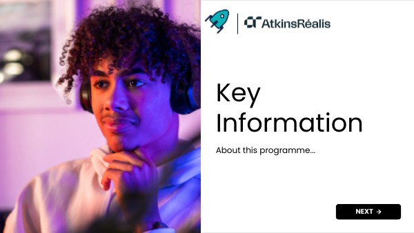 In this programme, you’ll gain an insight into everything that goes on at AtkinsRéalis, from building a better world through engineering and construction to their world-leading technology in aerospace, defence and security and how they look after their employees through fantastic cultural and wellbeing staff networks. You’ll get to dive deep into sustainability, energy, aerospace and social housing with immersing case studies. You’ll find out how projects are approached and managed, and you’ll try on many different hats as we take you through the multidisciplinary roles AtkinsRéalis has to offer.
