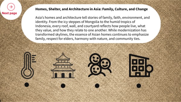 Homes, Shelter, and Architecture in Asia: Family, Culture, and Change Asia’s homes and architecture tell stories of family, faith, environment, and identity. From the icy steppes of Mongolia to the humid tropics of Indonesia, every roof, wall, and courtyard reflects how people live, what they value, and how they relate to one another. While modernization has transformed skylines, the essence of Asian homes continues to emphasize family, respect for elders, harmony with nature, and community ties.