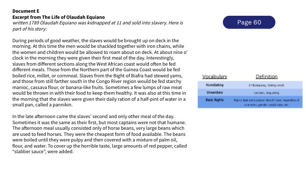 Document E Excerpt from The Life of Olaudah Equiano written 1789 Olaudah Equiano was kidnapped at 11 and sold into slavery. Here is part of his story: During periods of good weather, the slaves would be brought up on deck in the morning. At this time the men would be shackled together with iron chains, while the women and children would be allowed to roam about on deck. At about nine o’ clock in the morning they were given their first meal of the day. Interestingly, slaves from different sections along the West African coast would often be fed different meals. Those from the Northern part of the Guinea Coast would be fed boiled rice, millet, or cornmeal. Slaves from the Bight of Biafra had stewed yams, and those from still farther south in the Congo River region would be fed starchy manioc, cassava flour, or banana-like fruits. Sometimes a few lumps of raw meat would be thrown in with their food to keep them healthy. It was also at this time in the morning that the slaves were given their daily ration of a half-pint of water in a small pan, called a pannikin. In the late afternoon came the slaves’ second and only other meal of the day. Sometimes it was the same as their first, but most captains were not that humane. The afternoon meal usually consisted only of horse beans, very large beans which are used to feed horses. They were the cheapest form of food available. The beans were boiled until they were pulpy and then covered with a mixture of palm oil, flour, and water. To cover up the horrible taste, large amounts of red pepper, called “slabber sauce”, were added.