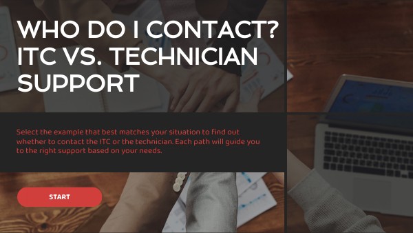 Select the example that best matches your situation to find out whether to contact the ITC or the technician. Each path will guide you to the right support based on your needs.