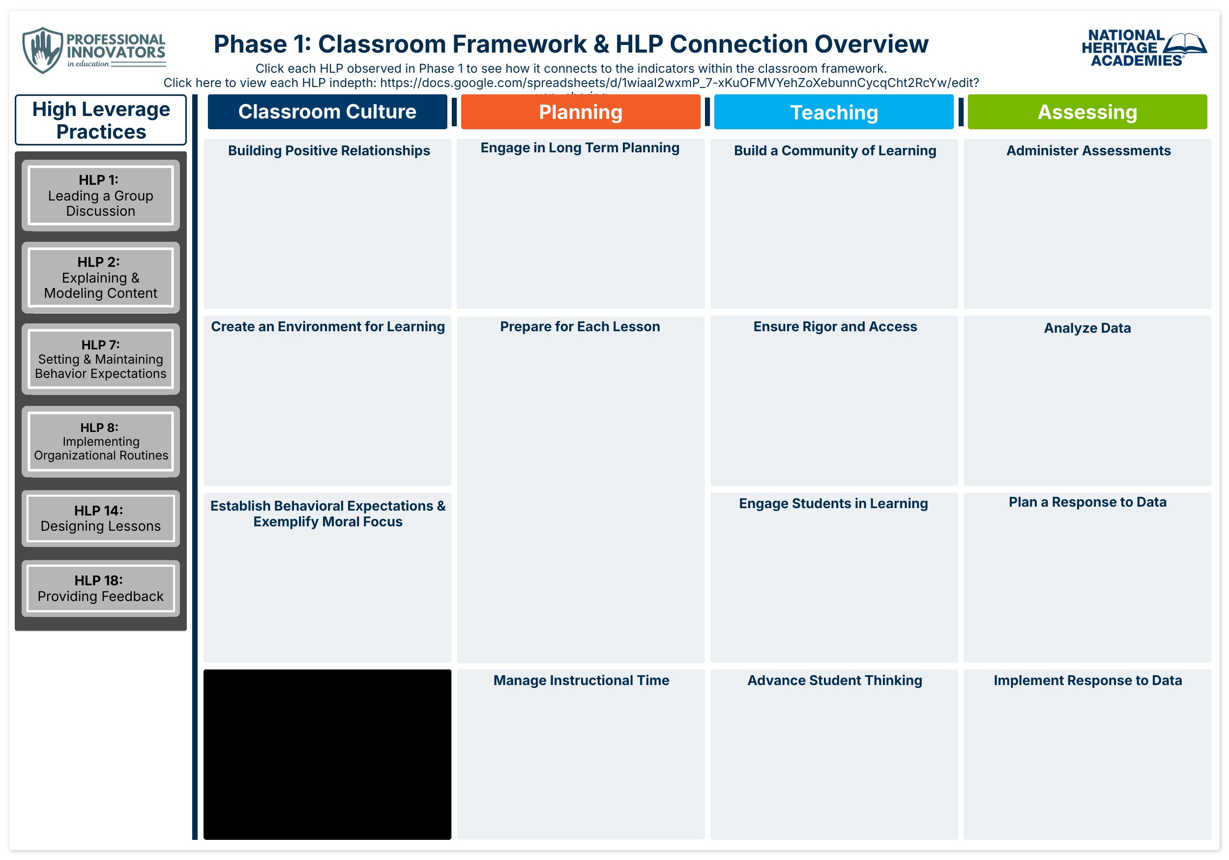 Click each HLP observed in Phase 1 to see how it connects to the indicators within the classroom framework.Click here to view each HLP indepth: https://docs.google.com/spreadsheets/d/1wiaaI2wxmP_7-xKuOFMVYehZoXebunnCycqCht2RcYw/edit?usp=sharing