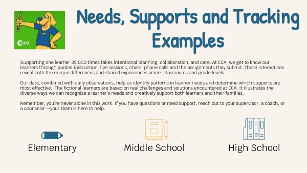 Supporting one learner 35,000 times takes intentional planning, collaboration, and care. At CCA, we get to know our learners through guided instruction, live sessions, chats, phone calls and the assignments they submit. These interactions reveal both the unique differences and shared experiences across classrooms and grade levels. Our data, combined with daily observations, help us identify patterns in learner needs and determine which supports are most effective. The fictional learners are based on real challenges and solutions encountered at CCA. It illustrates the diverse ways we can recognize a learner’s needs and creatively support both learners and their families. Remember, you’re never alone in this work. If you have questions or need support, reach out to your supervisor, a coach, or a counselor—your team is here to help.