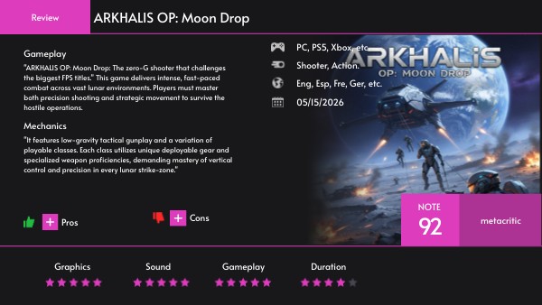 "ARKHALIS OP: Moon Drop: The zero-G shooter that challenges the biggest FPS titles." This game delivers intense, fast-paced combat across vast lunar environments. Players must master both precision shooting and strategic movement to survive the hostile operations.