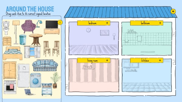 For teachers For teachersHave your students learn the different parts of the house, along with direction signs (left, right, next-to, behind, in-front, under, and above) in a fun and interactive way.Help them practice their signs for parts of the house and giving directions by signing the items and signing where each item should be placed. Once completed, show a screenshot of the correct locations for the students to test their receptive skills.For studentsDrag and drop each item to the correct room based on what is being signed to you. For students Drag and drop each item to the correct location being signed to you.
