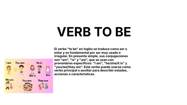 El verbo "to be" en inglés se traduce como ser o estar y es fundamental por ser muy usado e irregular. En presente simple, sus conjugaciones son "am", "is" y "are", que se usan con pronombres específicos: "I am", "he/she/it is" y "you/we/they are". Este verbo puede usarse como verbo principal o auxiliar para describir estados, acciones o características.