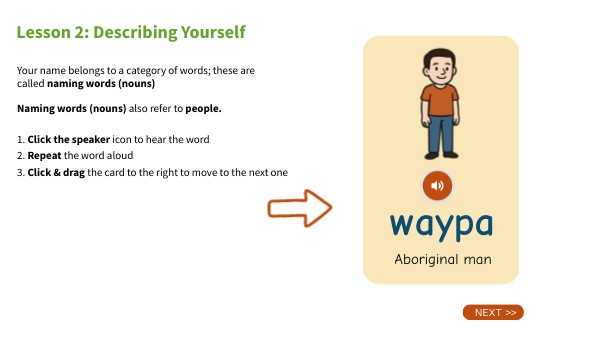1. Click the speaker icon to hear the palawa kani word2. Repeat the word out loud3. Click & drag the card to the right to move to the next one.