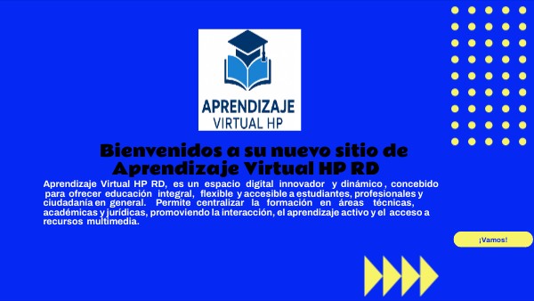 Aprendizaje Virtual HP RD, es un espacio digital innovador y dinámico , concebido para ofrecer educación integral, flexible y accesible a estudiantes, profesionales y ciudadanía en general. Permite centralizar la formación en áreas técnicas, académicas y jurídicas, promoviendo la interacción, el aprendizaje activo y el acceso a recursos multimedia.
