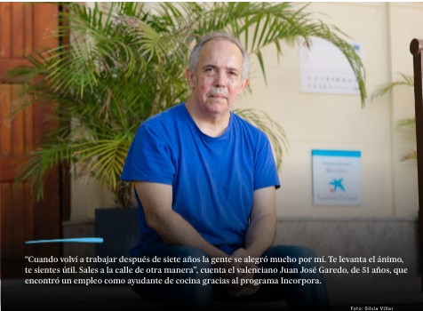 “Cuando volví a trabajar después de siete años la gente se alegró mucho por mí. Te levanta el ánimo, te sientes útil. Sales a la calle de otra manera”, cuenta el valenciano Juan José Garedo, de 51 años, que encontró un empleo como ayudante de cocina gracias al programa Incorpora.