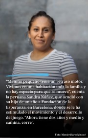 “Mi niño pequeño tenía un retraso motor. Vivimos en una habitación toda la familia y no hay espacio para que se mueva”, cuenta la peruana Sandra Núñez, que acudió con su hijo de un año a Fundación de la Esperanza, en Barcelona, donde se le ha estimulado el movimiento y el desarrollo del juego. “Ahora tiene dos años y medio y camina, corre”.