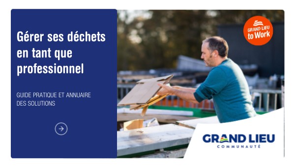 Ce guide a été pensé pour éclairer vos choix en matière de gestion des déchets et valoriser les entreprises locales qui oeuvrent pour une gestion vertueuse des déchets. Vous y retrouverez les informations à connaître en matière de réglementation et de lières de traitement des déchets et une liste non exhaustive des solutions existantes sur le territoire de Grand Lieu et ses environs.S’inscrivant dans une démarche collective, ce guide se veut pratique pour les professionnels qui le consultent. Il a été testé par des professionnels volontaires an de correspondre au mieux à vos attentes.