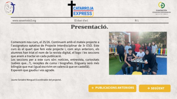 Comencem nou curs, el 25/26. Continuem amb el mateix projecte a l'assignatura optativa de Projecte Interdisciplinar de 3r ESO. Este curs és el quart que fem este projecte i, com anys anteriors, els alumnes han triat el nom de la revista digital, el logo i les seccions que anem a tractar en cada publicació.Les seccions per a este curs són: notícies, entrevista, curiositats (sabies que...?), receptes de cuina i biografies. Enguany serà més bilingüe que mai (igual escrivim en valencià que en castellà). Esperem que gaudiu i vos agrade.
