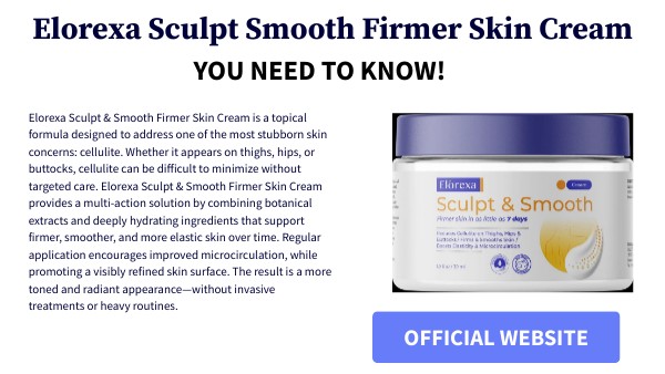 Elorexa Sculpt & Smooth Firmer Skin Cream is a topical formula designed to address one of the most stubborn skin concerns: cellulite. Whether it appears on thighs, hips, or buttocks, cellulite can be difficult to minimize without targeted care. Elorexa Sculpt & Smooth Firmer Skin Cream provides a multi-action solution by combining botanical extracts and deeply hydrating ingredients that support firmer, smoother, and more elastic skin over time. Regular application encourages improved microcirculation, while promoting a visibly refined skin surface. The result is a more toned and radiant appearance—without invasive treatments or heavy routines.