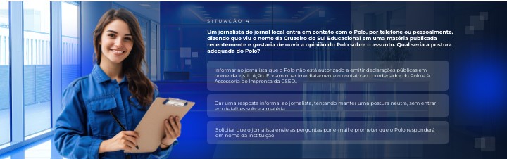 Um jornalista do jornal local entra em contato com o Polo, por telefone ou pessoalmente, dizendo que viu o nome da Cruzeiro do Sul Educacional em uma matéria publicada recentemente e gostaria de ouvir a opinião do Polo sobre o assunto. Qual seria a postura adequada do Polo?