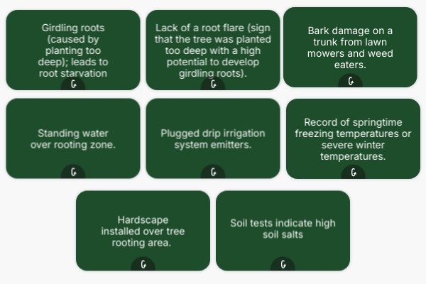 Girdling roots (caused by planting too deep); leads to root starvation