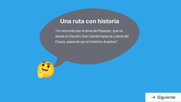 En el centro historico de la ciudad de Popayán, iniciamos una ruta turística pero con mucha historia que inicia desde la Fundación Univeritaria de Popayán , sede San Camilo ubicada en la Calle novena. El recorrido continua por la calle novena, para despúes seguir por la Calle séptima la cualencontramos la iglesia San Agustin antes de llegar al antiguo centro comercial Anarkos, para proseguir con la ruta, pasamos por el Politecnico Gran Colombiano, ubicado en la Carrera sexta, hasta llegar al histórico Parque Caldas, el cual se toma como referencia la Camara de Comercio del Cauca , para continuar por el Colegio Mayor del Cauca