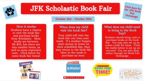 Los estudiantes tienen la oportunidad de visitar la feria del libro y comprar libros de Scholastic. La mayoría de los libros cuestan entre 4 y 10 dólares, pero también hay artículos más pequeños, así como otros más caros. ¡Haga clic a continuación para ver algunos artículos de la feria del libro!