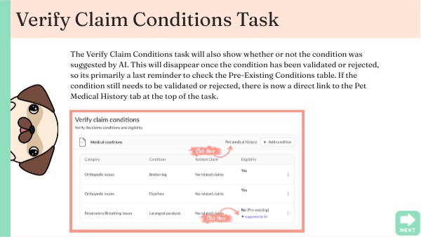 The Verify Claim Conditions task will also show whether or not the condition was suggested by AI. This will disappear once the condition has been validated or rejected, so its primarily a last reminder to check the Pre-Existing Conditions table. If the condition still needs to be validated or rejected, there is now a direct link to the Pet Medical History tab at the top of the task.