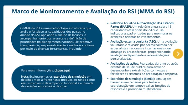 O MMA do RSI é uma metodologia estruturada que avalia e fortalece as capacidades dos países no âmbito do RSI, apoiando a análise de lacunas, o acompanhamento dos avanços e a definição de prioridades no planejamento nacional. Ele promove transparência, responsabilização e melhoria contínua por meio de diversas ferramentas, incluindo: