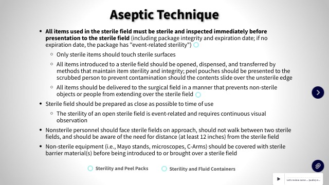 - All items used in the sterile field must be sterile and inspected immediately before presentation to the sterile field (including package integrity and expiration date; if no expiration date, the package has "event-related sterility")