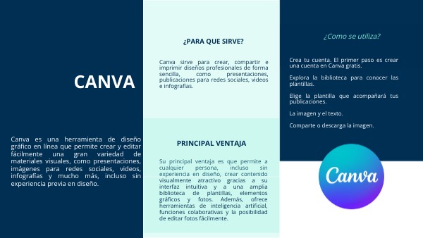 Canva es una herramienta de diseño gráfico en línea que permite crear y editar fácilmente una gran variedad de materiales visuales, como presentaciones, imágenes para redes sociales, videos, infografías y mucho más, incluso sin experiencia previa en diseño.