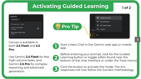 Start a New Chat in the Gemini web app or mobile app. Before entering your prompt, look for the Guided Learning button or toggle (often found near the bottom of the chat interface or under the Tools menu). Click the button to activate the mode. The AI's responses will now follow the Socratic methodology.