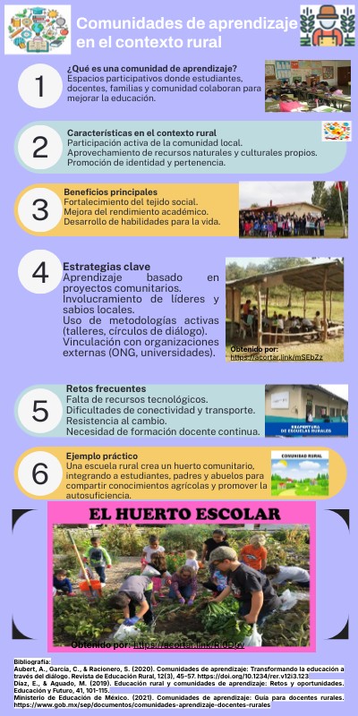 Bibliografía: Aubert, A., García, C., & Racionero, S. (2020). Comunidades de aprendizaje: Transformando la educación a través del diálogo. Revista de Educación Rural, 12(3), 45-57. https://doi.org/10.1234/rer.v12i3.123 Díaz, E., & Aguado, M. (2019). Educación rural y comunidades de aprendizaje: Retos y oportunidades. Educación y Futuro, 41, 101-115. Ministerio de Educación de México. (2021). Comunidades de aprendizaje: Guía para docentes rurales. https://www.gob.mx/sep/documentos/comunidades-aprendizaje-docentes-rurales
