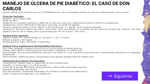 Usted trabaja como enfermera/o en el CESFAM Recreo y le corresponde realizar el control cardiovascular a Don Carlos. Ficha del Paciente:Nombre: Carlos Rojas Soto Edad: 68 años Diagnósticos: Diabetes Mellitus 2 (DM2) de 15 años de evolución, Hipertensión Arterial (HTA) en tratamiento. Tratamiento actual: Metformina 850 mg 2 veces/día, Losartán 50 mg/día. Últimos exámenes (hace 1 mes): HbA1c: 8.2%, Creatinina: 1.1 mg/dL, Perfil lipídico alterado. Anamnesis: Paciente refiere que hace "unos días" notó una herida en la planta del pie derecho después de caminar con unos zapatos nuevos. No le duele, pero le preocupa que "no se ve bien". Vive solo. Examen Físico General: Signos Vitales: PA: 145/88 mmHg, FC: 82 lpm, T°: 36.7 °C axilar. Glicemia capilar: 195 mg/dL. Estado general: Vigil, orientado, cooperador. Examen Físico Segmentario (Extremidades Inferiores): Piel: Seca, delgada, ausencia de vello en el tercio distal de ambas piernas. Pulsos: Pulso pedio y tibial posterior presentes y palpables en ambos pies. Sensibilidad: Test de monofilamento alterado (no siente en 3 de 4 puntos en pie derecho). Sensibilidad vibratoria con diapasón disminuida. Deformidades: Dedos en garra y prominencia de cabezas metatarsales en ambos pies. Valoración de la Úlcera (Pie Derecho): Localización: Plantar, bajo la cabeza del primer metatarsiano. Tamaño: 2 cm de largo x 1.5 cm de ancho. Lecho de la herida: 80% tejido de granulación, 20% tejido esfacelado amarillo. Exudado: Moderado, sero-turbio. Piel perilesional: Levemente macerada, sin eritema ni aumento de temperatura. Dolor: El paciente niega dolor a la palpación.