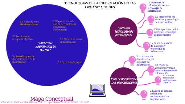 Este mapa presenta las áreas de impacto de los SI y la TI en la sociedad, incluyendo beneficios como eficiencia, innovación y colaboración, así como desafíos como la privacidad y la desigualdad digital.