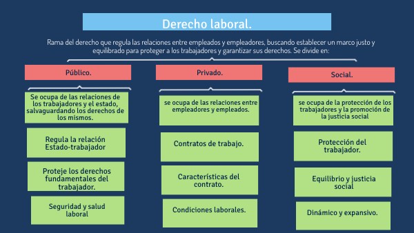 Rama del derecho que regula las relaciones entre empleados y empleadores, buscando establecer un marco justo y equilibrado para proteger a los trabajadores y garantizar sus derechos. Se divide en: