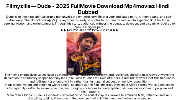 Dude is an inspiring spiritual drama that unveils the extraordinary life of a yogi dedicated to truth, inner peace, and self-discovery. The film follows Ajey’s journey from his early struggles to his transformation into a guiding light for those seeking wisdom and enlightenment. Through his story, audiences witness the courage, devotion, and discipline required to pursue a higher path. ⬇️⬇️⬇️CLICK HERE TO DOWNLOAD⬇️⬇️⬇️ The movie emphasizes values such as meditation, compassion, simplicity, and resilience, showing how Ajey’s unwavering dedication to spirituality shapes not only his life but also touches the lives of others. It reminds viewers that true happiness and fulfillment are found within, rather than in material success or worldly recognition. Visually captivating and enriched with a soulful soundtrack, the film immerses viewers in Ajey’s serene world. Each scene is thoughtfully crafted to evoke reflection, encouraging audiences to contemplate their own journey toward purpose and inner harmony. More than a biopic, Dude is a cinematic exploration of the soul. It inspires viewers to embrace faith, patience, and self-discipline, guiding them toward their own path of enlightenment and lasting inner peace.
