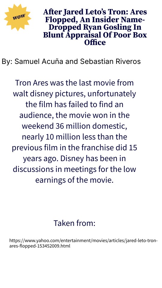 Tron Ares was the last movie from walt disney pictures, unfortunately the film has failed to find an audience, the movie won in the weekend 36 million domestic, nearly 10 million less than the previous film in the franchise did 15 years ago. Disney has been in discussions in meetings for the low earnings of the movie. Taken from: