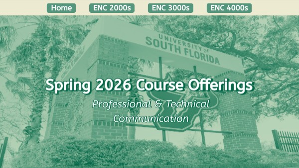 E. Olds ENC 2251-014, 027 | CRN 19893, 19907Mondays & Wednesdays, 3:30 PM - 4:45 PMClass Lecture | Tampa Campus, BSN 1309Tuesdays & Thursdays, 3:30 PM - 4:45 PMClass Lecture | Tampa Campus, CPR 462