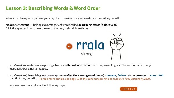 When introducing who you are, you may like to provide more information to describle yourself. rrala means strong. It belongs to a category of words called describing words (adjectives). Click the speaker icon to hear the word, then say it aloud three times.