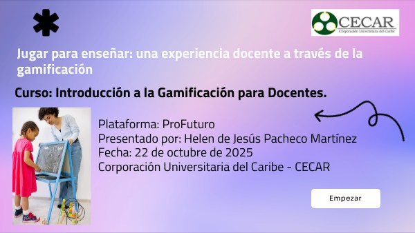 El curso "Introducción a la Gamificación para Docentes", fue ofertado por la plataforma ProFuturo, la cual hace parte de la Escuela de Innovación Educativa y tiene una duración estimada de 40 horas. Su estructura está compuesta por siéte módulos progresivos que combinan teoría, práctica y reflexión pedagógica. En ellos, los docentes aprenden los fundamentos de la gamificación, el diseño de juegos, las dinámicas motivacionales y las herramientas necesarias para aplicar estrategias lúdicas en contextos educativos reales. La temática central del curso se enfoca en cómo el juego puede convertirse en un motor de aprendizaje significativo, promoviendo la participación, la motivación intrínseca y la creatividad de los estudiantes. A lo largo del curso, se llevan a cabo autores fundamentales como Steven Reiss, Richard Bartle, Jon Radoff, Raph Koster y Joseph Campbell, cuyas teorías sobre motivación, tipos de jugadores, elementos de diversión y narrativa sustentan los principios de la gamificación educativa.