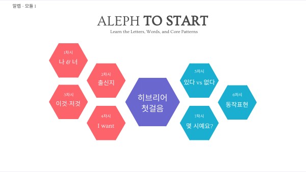 알렙 - 모듈 1은 히브리어를 처음 접하는 분들을 위한 기초 완성 프로그램입니다. 이 과정에서는 모든 글자와 발음을 익히고, 기본적인 어휘와 문장 구조, 인칭 표현을 배웁니다. 기초부터 차근차근 쌓아가며, 이후 초급 단계로 나아갈 때 흔들리지 않는 언어적 토대를 마련하는 과정입니다.